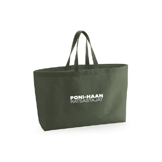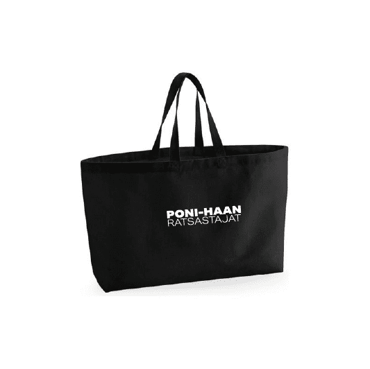 Valkoinen Poni-Haan ratsastajat teksti painettu laukun sivuun.