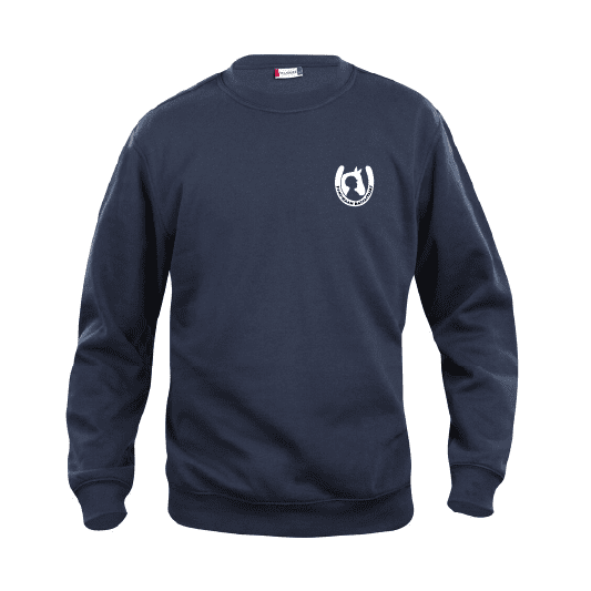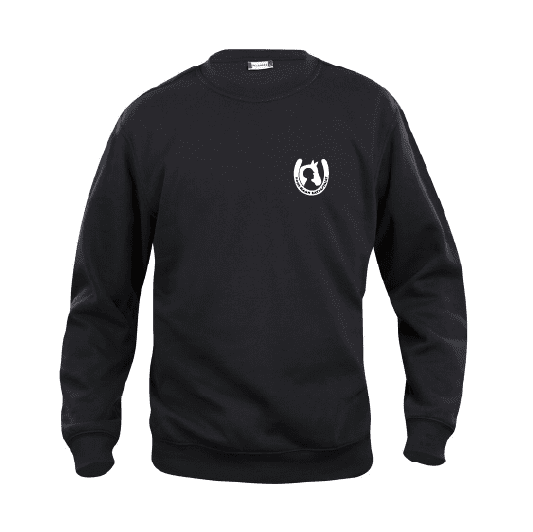 Collegepaita, jossa valkoinen Poni-Haan Ratsastajat logo vasemmassa rinnassa ja valkoinen Poni-Haan Ratsastajat teksti selässä.